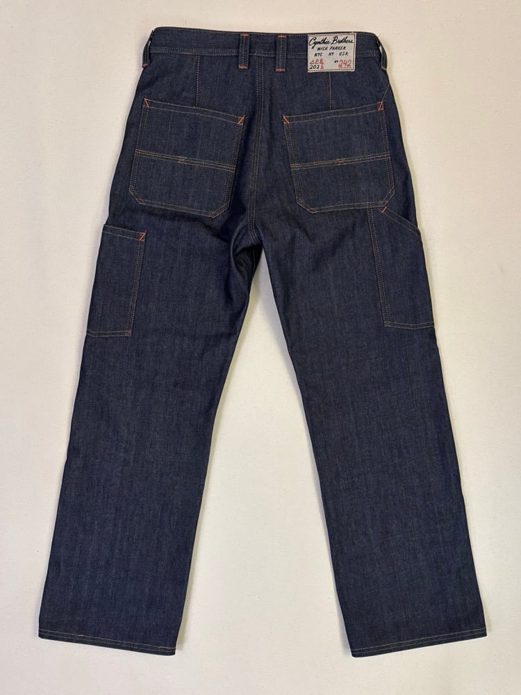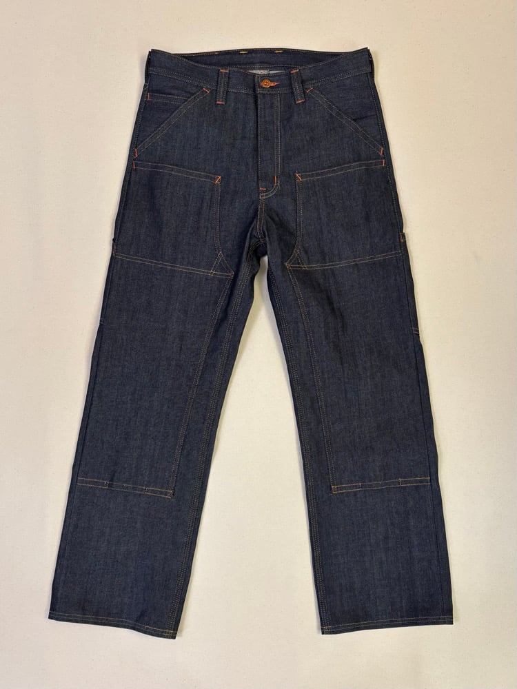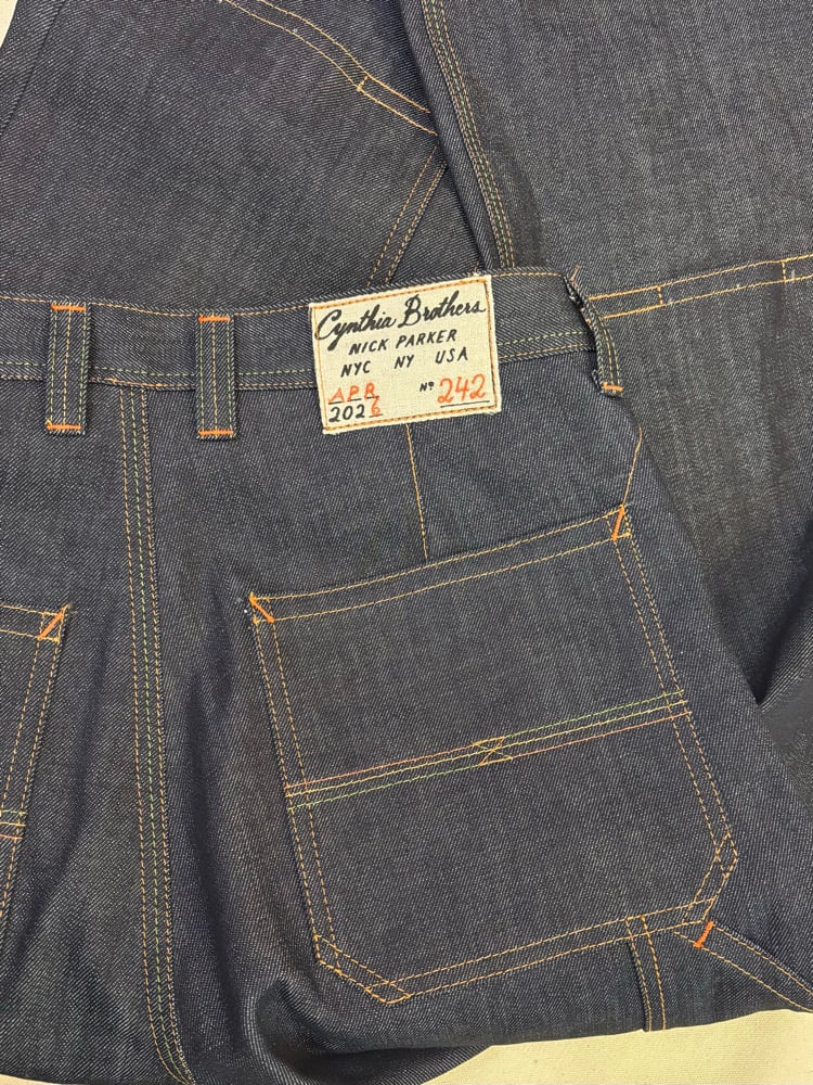 12oz. Italian indigo denim, double front w integrated pockets - 9pockets - tex80 gold and green topstitching , orange bartacks and buttonhole freehand sewn on the Necchi BU Mira. Multicolors green, red, cyan overlocking. Copper hardware from citron jeans, heavy YKK zip.