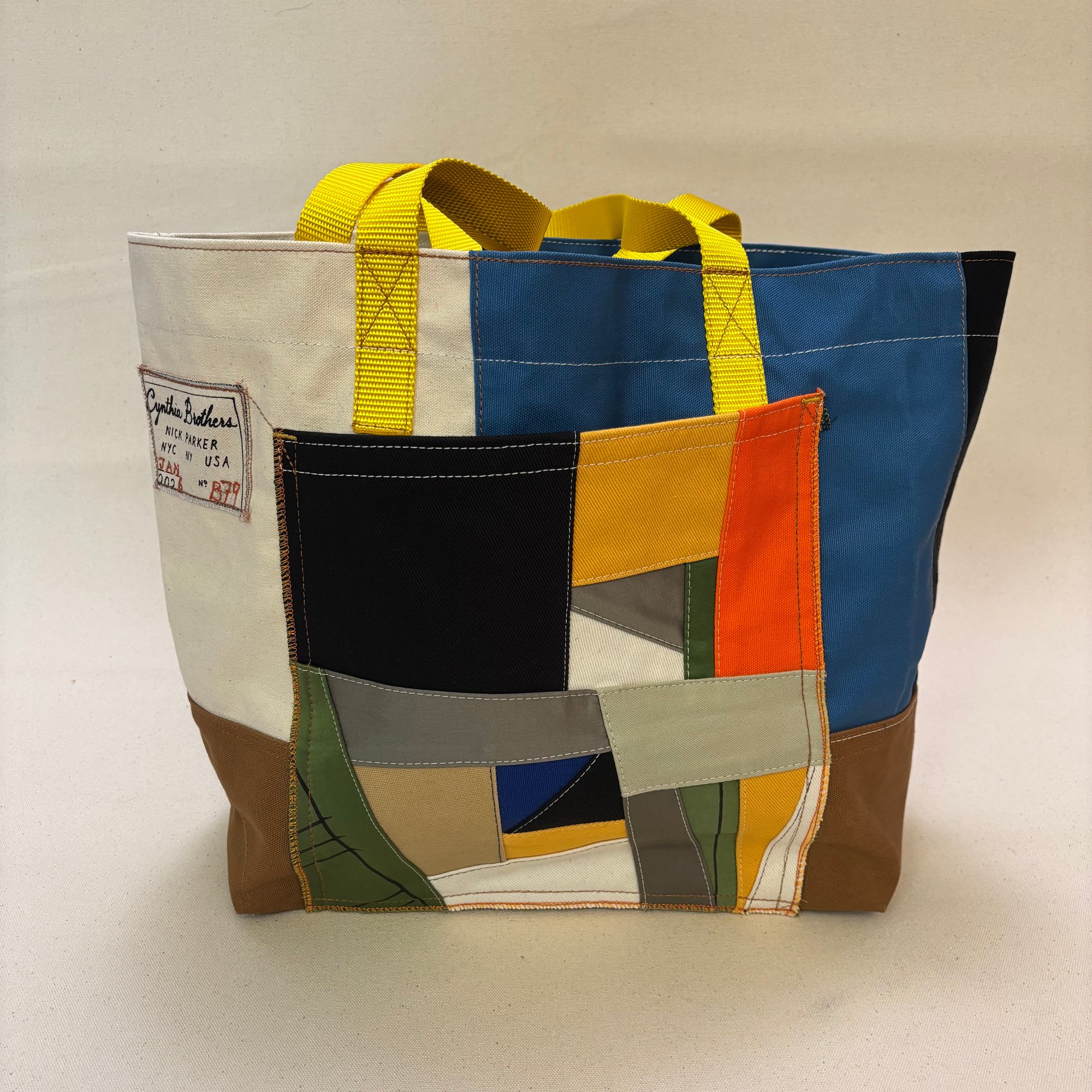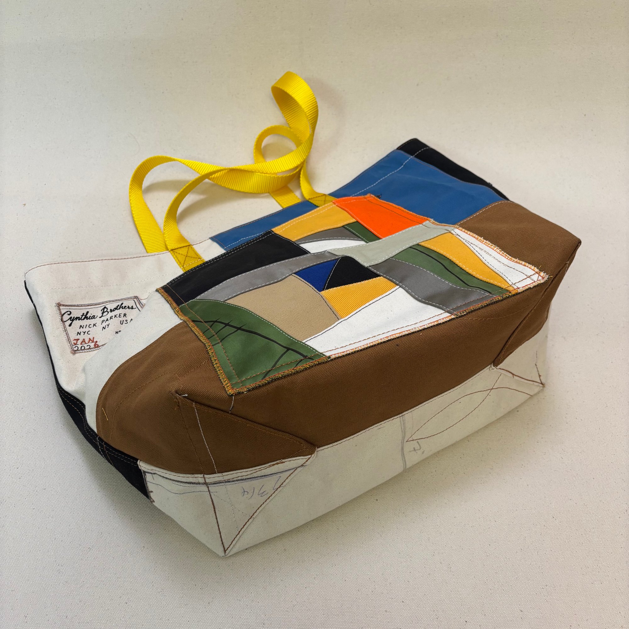 exposed 516 stitch overlock. cordura reinforced bottom. Nylon webbing handles. Screenprinted Cynthia Brothers logo w/ freehand straight-stitch machine embroidered number and date