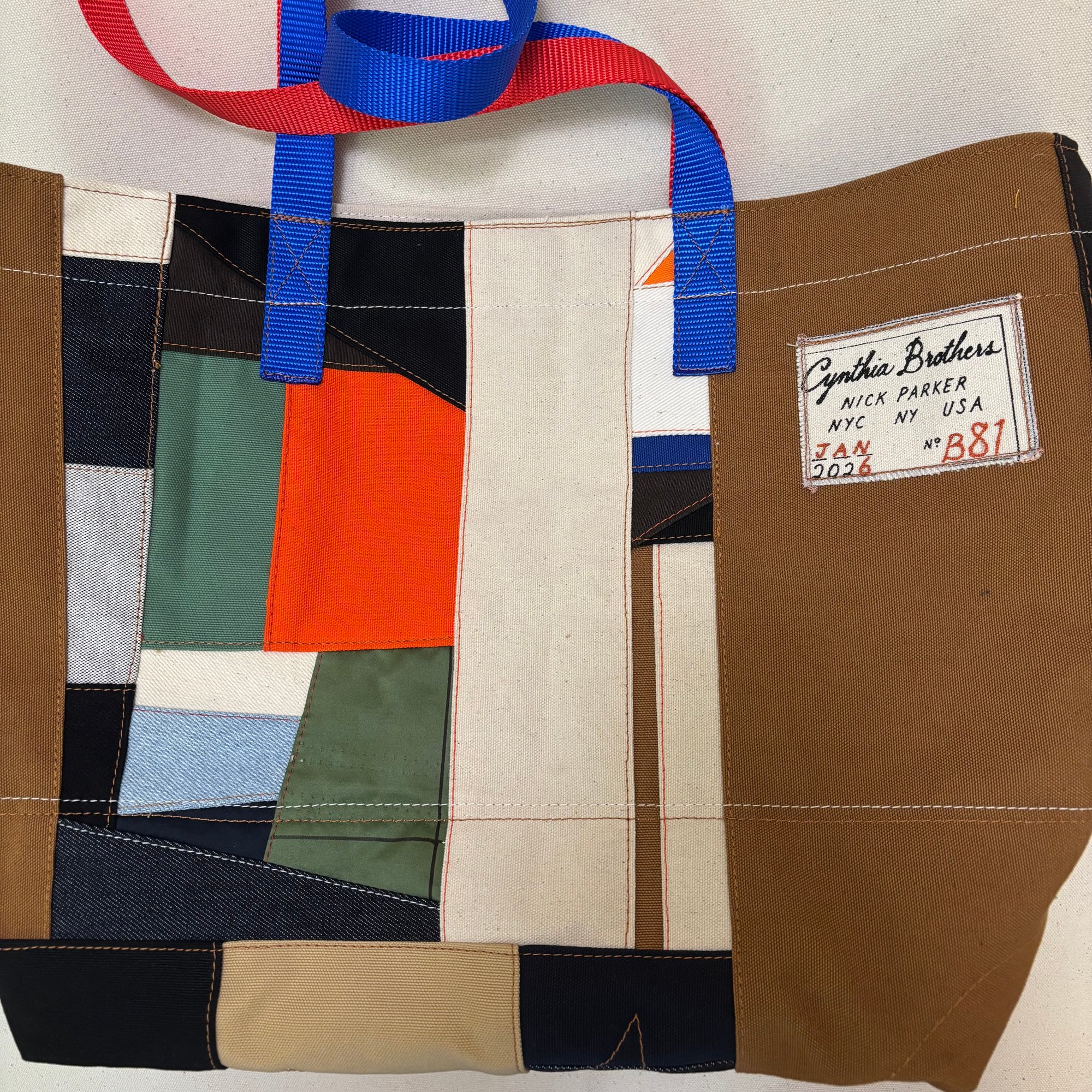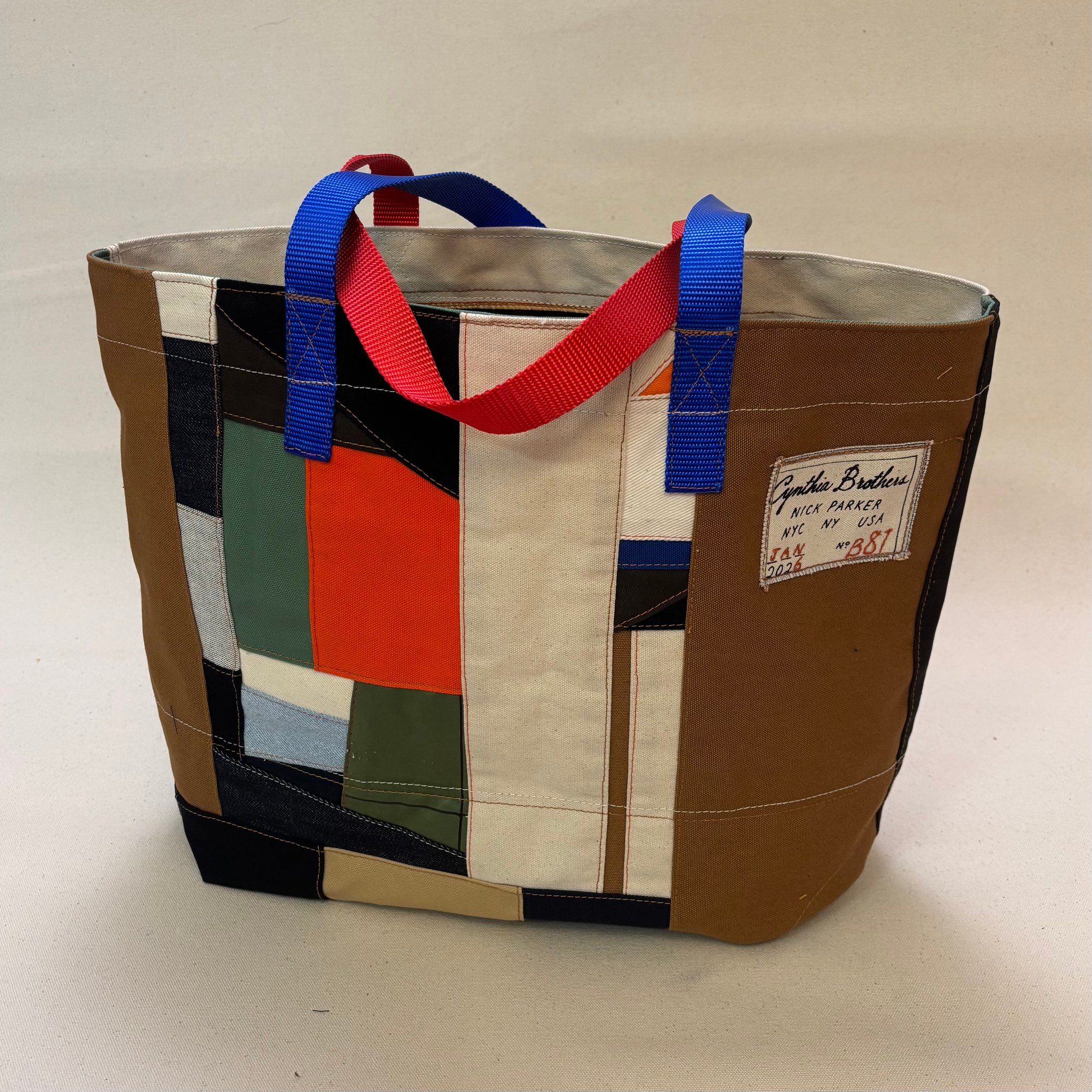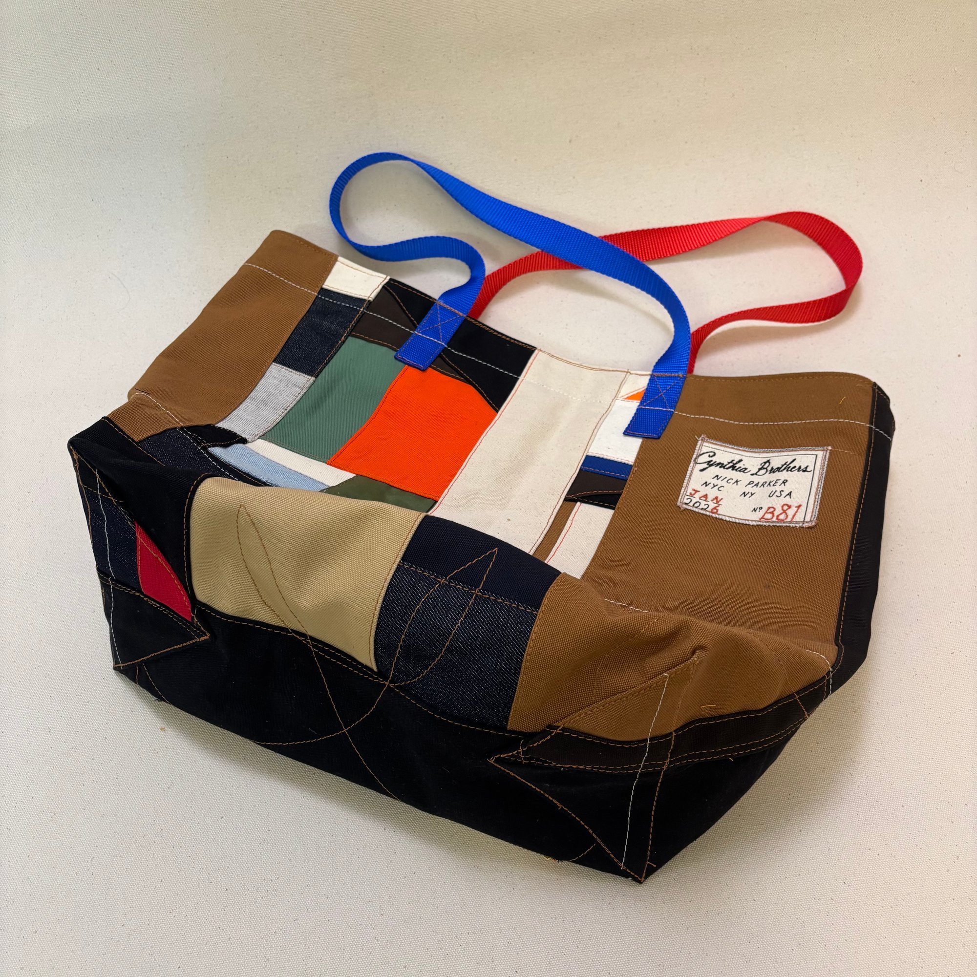 exposed 516 stitch overlock. ripstop nylon reinforced bottom. Nylon webbing handles. Screenprinted Cynthia Brothers logo w/ freehand straight-stitch machine embroidered number and date