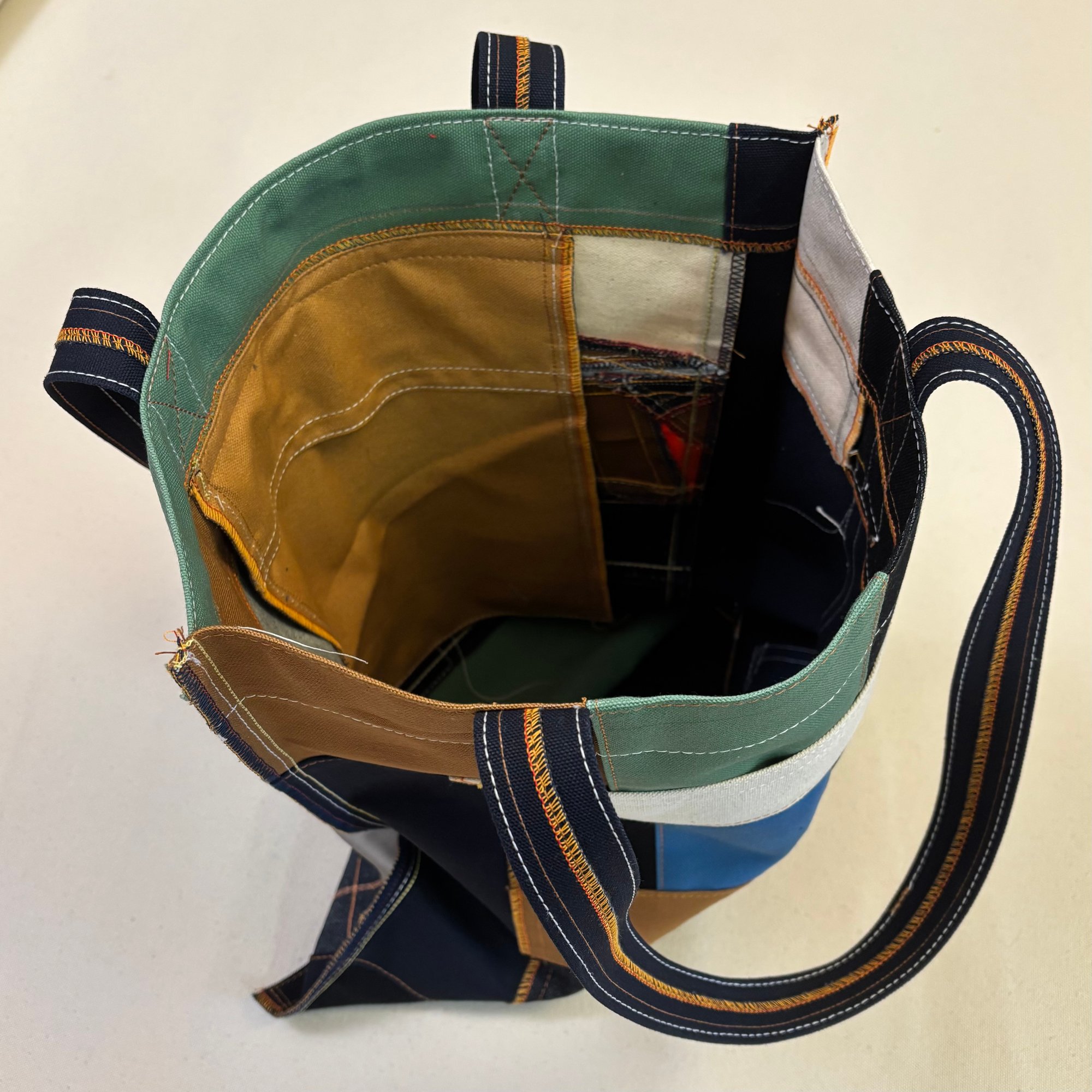 denim and canvas offcuts and scraps collected over years from cutting my garments, patched together from Aug.2025 - Jan.2026 on the Juki2516 and topstitched on singer 96sv19