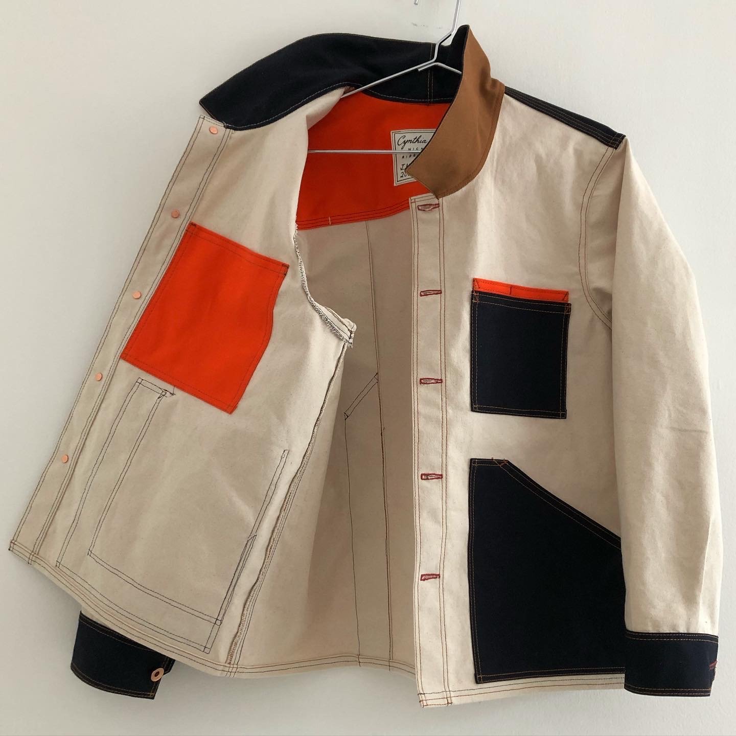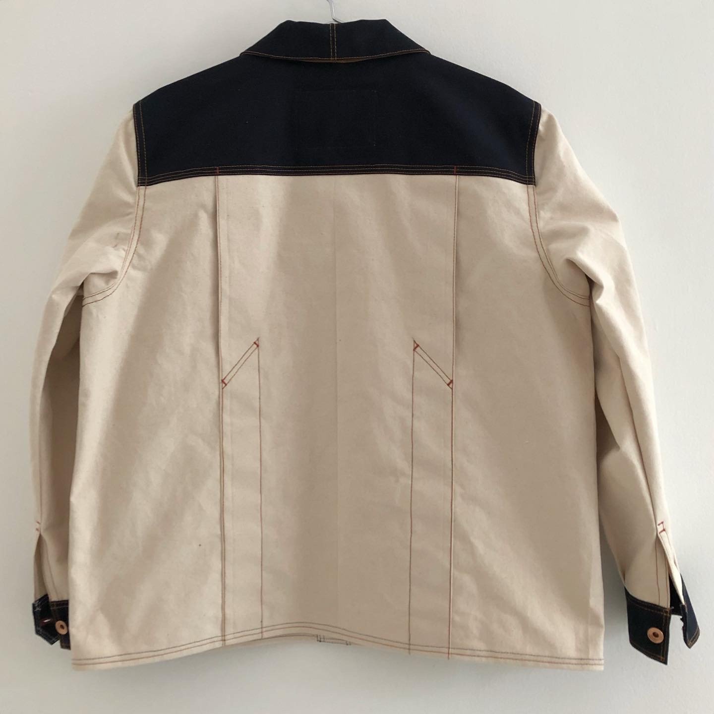 12ounce cotton duck canvas in natural, midnight and orange. t80 gold topstitching t40 midnight under, red bartacks and buttonholes, 2-prong donut buttons from citron jeans.